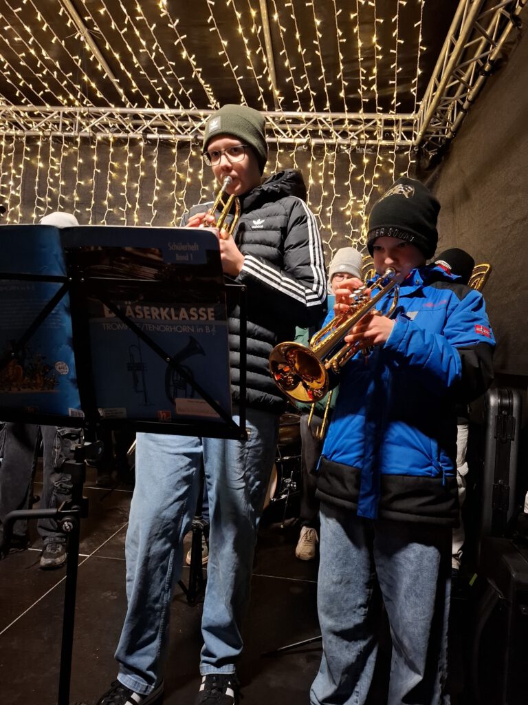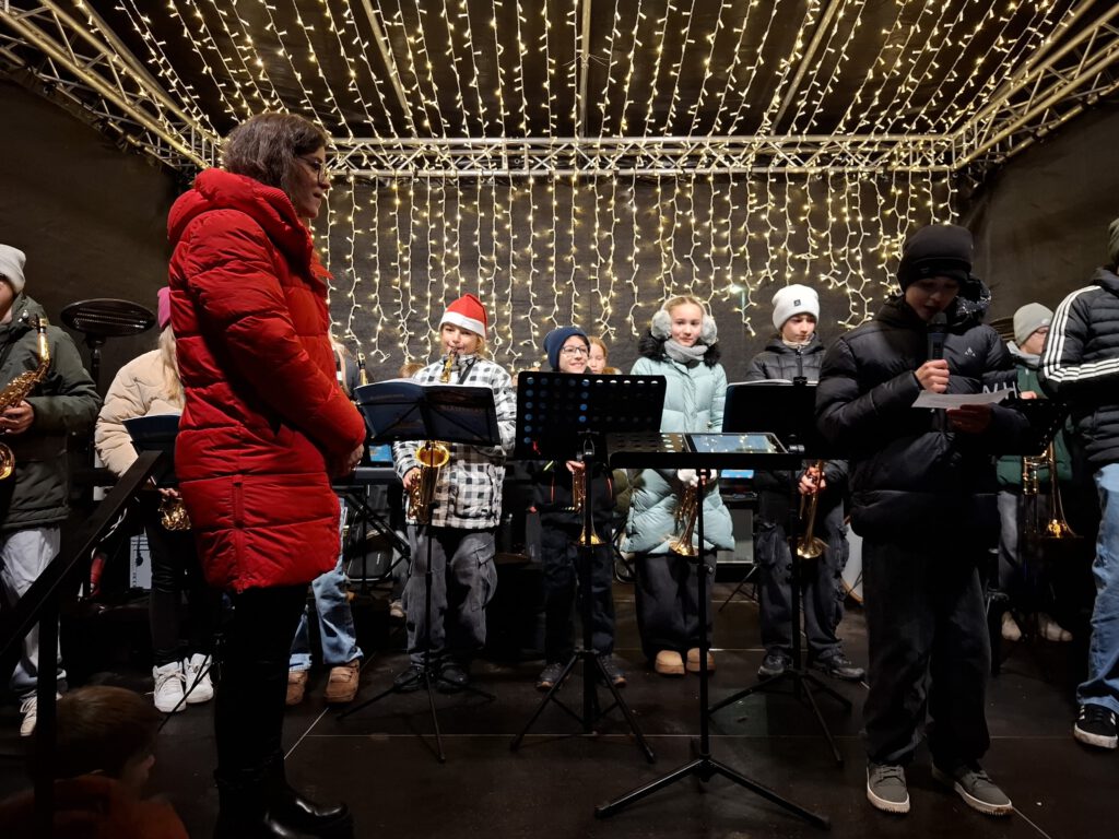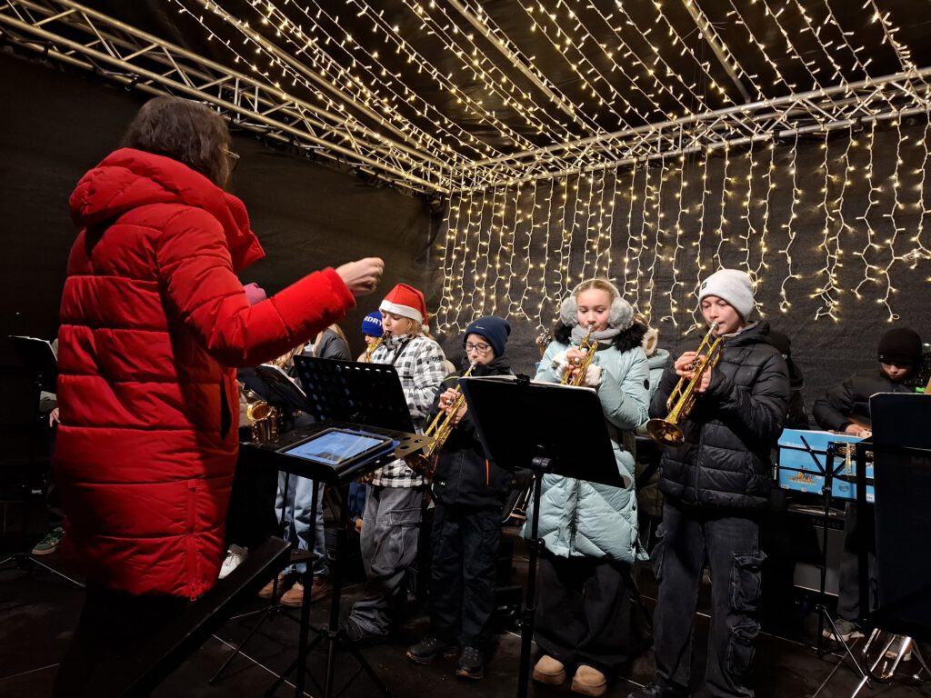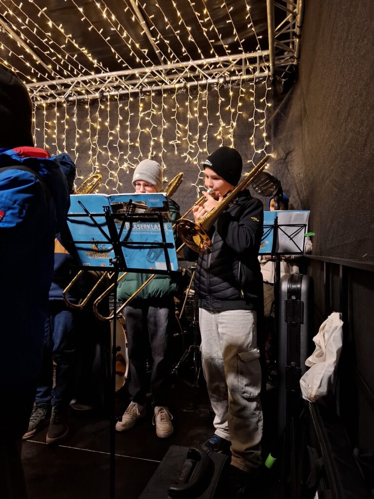 Obwohl das Wetter an diesem Dezembertag eher untypisch war – warm, regnerisch und wenig winterlich – hatten unsere jungen Musikerinnen und Musiker großes Glück: Genau während ihres Auftritts blieb der Regen aus, sodass sowohl Publikum als auch Instrumente trocken blieben.