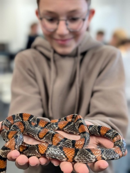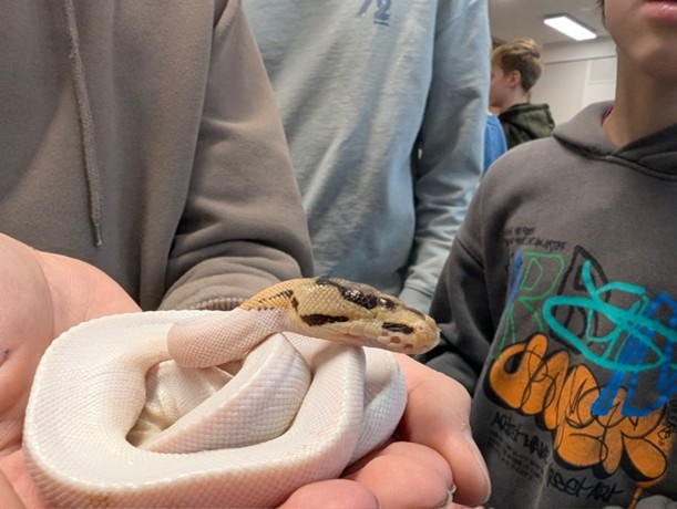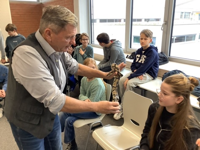 Wir, die 6. Klassen, bekamen Besuch von Herrn Manfred Werdan. Bei dem Reptilienexperten durften wir viele verschiedene Reptilien und Amphibien bewundern – zum Beispiel ein sich häutendes Chamäleon, süße Babyschildkröten und eine falsche Schlange. Herrn Werdans Erklärungen über diese Tiere waren sehr interessant und wir hörten ihm gespannt zu. (Ein Beitrag von Johanna Baumeister, Hannah Hofmann und Bastian Rucker-Forster, 6c.)