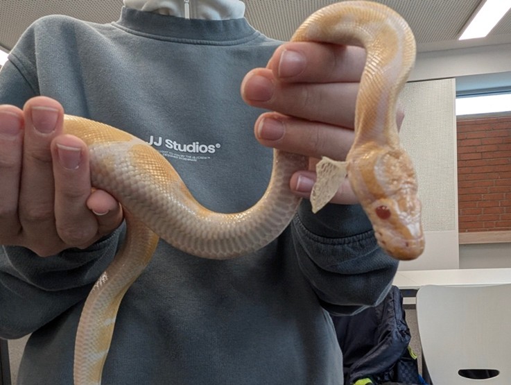 Das Schönste aber kam zum Schluss. Da durften wir die Tiere auf die Hand nehmen und uns damit fotografieren lassen. Der braune Königspython war schwerer als gedacht. Die Haut fühlte sich glatt und trocken an und man konnte die Hautschuppen spüren.