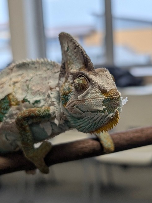Ein Vertreter der Amphibien war ein Axolotl, das sein Leben lang als Larve im Wasser lebt und Außenkiemen besitzt. Von den Reptilien hatte er eine große Auswahl an Schlangen dabei, wie z. B. eine Ringelnatter, einen Albino-Netzpython, einen Königspython und eine falsche Korallenschlange. Auch eine Giftschlange hatte er dabei, nämlich die Hornotter, die giftigste Schlange Europas – Gott sein Dank gut abgeschirmt in einem Terrarium. Das Chamäleon, das sich an einem kleinen Ast festklammerte, häutete sich gerade und reagierte mit Fauchen, als wir ihm zu nahe kamen.