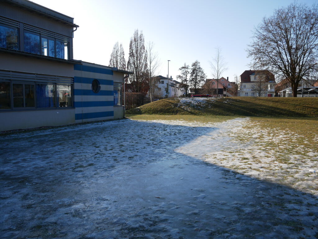Eisige Nächte = gefrorener Pausenhof! Wer frühmorgens das Schulhaus über den Pausenbereich betritt, kann eine zentimeterdicke Eisschicht auf dem Schulrasen und dem Beachvolleyballfeld erkennen. Doch weil es leider keine Anmeldungen für die Wahlfächer „Eishockey“, „Eisstockschießen“ und „Eiskunstlauf“ gegeben hat, muss die Natureisfläche aufgrund zu großer Rutschgefahr ab sofort gesperrt werden. (Ein Beitrag von Ben und Melania.)
