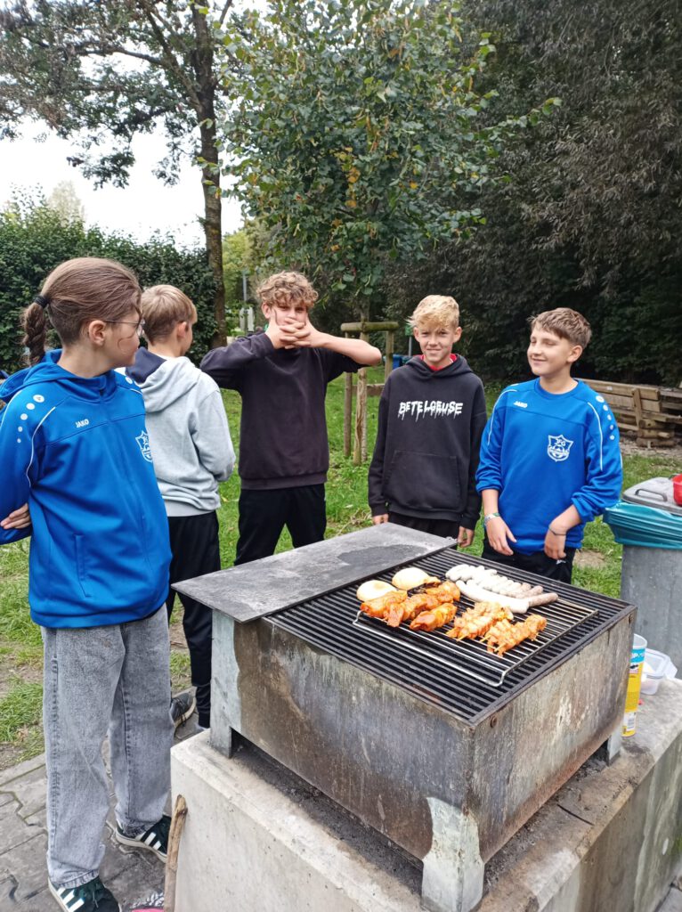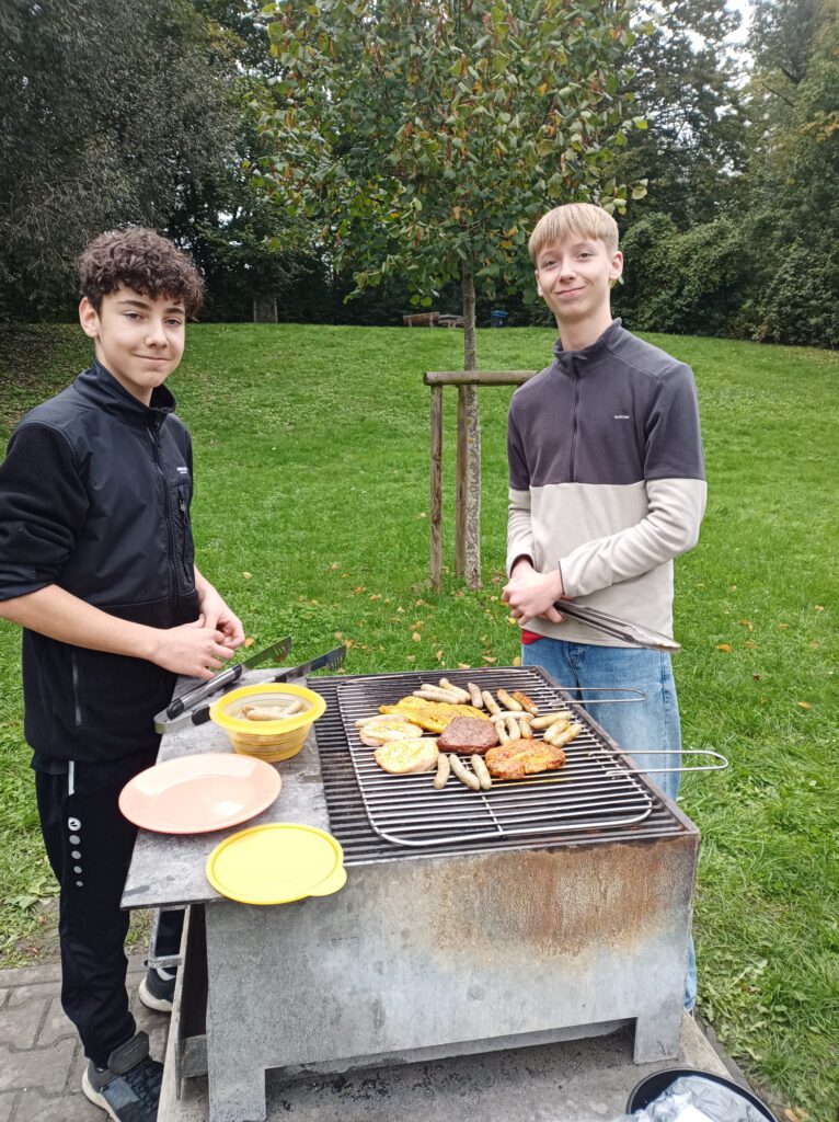 Aber was ist das? Am anderen Ende des Sees steigen plötzlich Rauchzeichen auf! Geheime Botschaften? Wanderer in Not? Je mehr man sich den Rauchzeichen nähert, desto auffälliger wird der Geruch: Knoblauch, Curry, Paprika… Unglaublich! Die 8a hat hier ein Barbecue der Extraklasse am Laufen. Auf den Grillrosten brutzeln Unmengen an Würstchen, Spießen, Steaks. Feinstes Roastbeef, vor Ort mariniert, findet genauso seinen Weg auf den Grill wie die typisch bayerische Leberkasscheibe. Um’s Feuer haben sich motivierte Junggriller versammelt, um den Wettbewerb um die beste Glut zu gewinnen. Selbst für das Dessert ist gesorgt, Kuchen, Muffins und Brownies wurden liebevoll vorbereitet und mitgebracht. So kann das Schuljahr anfangen!