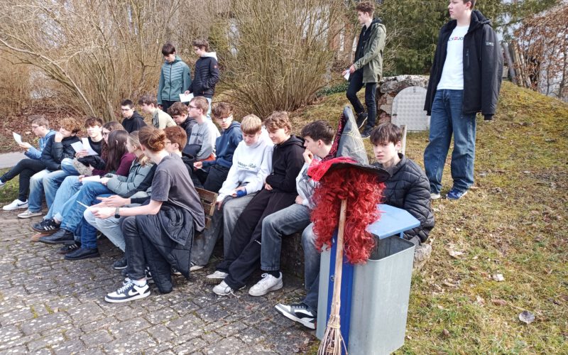 Was haben ein Hexenbesen, eine rote Perücke und ein Hexenhut zusammen mit 21 Schülern am Galgenbrunnen in Beingries, oberhalb der evangelischen Kirche zu suchen? Unsere